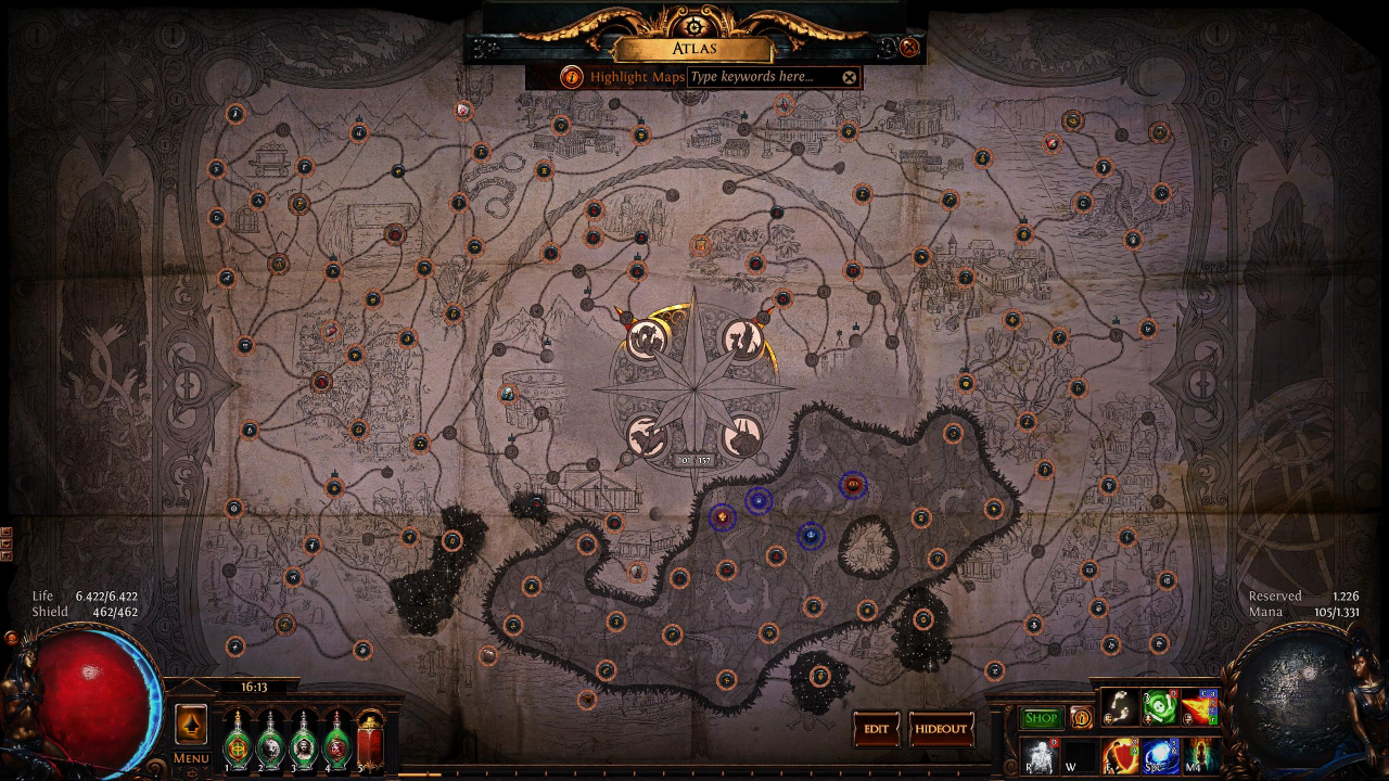 이 티어16 맵을 클리어하면 100%의 확률로 보스가 위의 스크린샷과 같은 2x2의 4칸짜리 지도를 1/4로 조각낸 모양의 지도 조각을 드랍한다. 티어16 맵 4개를 전부 클리어해서 지도 조각 4개를 모으고, 지도 장치에 모양을 맞추어 4개의 지도 조각을 넣고 작동시키면 티어17 최종보스가 있는 쉐이퍼의 영역으로 갈 수 있다. 이것이 아틀라스의 메인 목표라고 생각하면 된다.